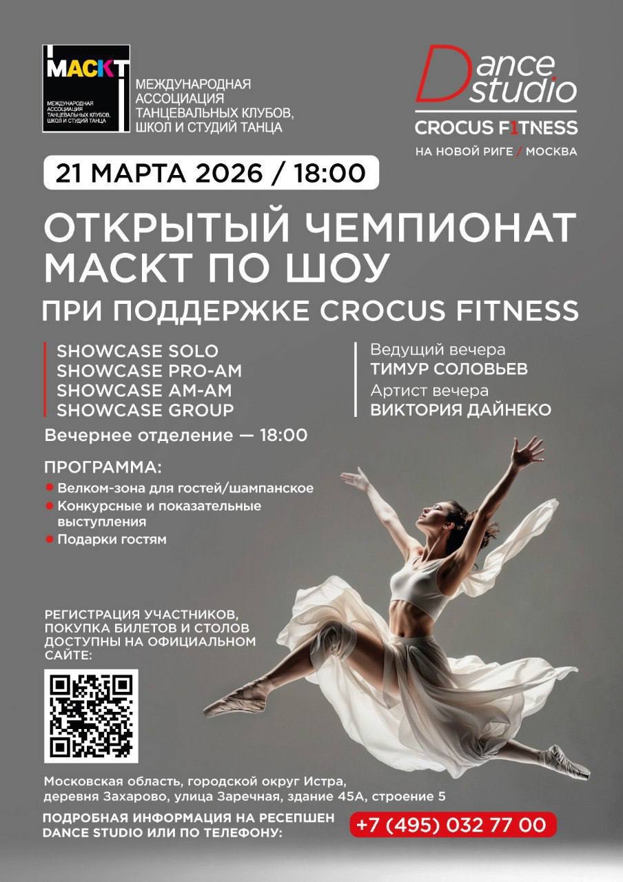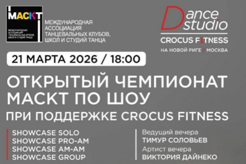 21 марта в 18:00 в танцевальной студии Crocus Fitness в Estate Mall состоится второй открытый чемпионат МАСКТ — Московской ассоциации студий и школ танцев по шоу.